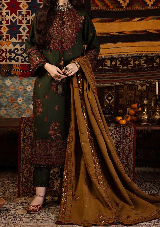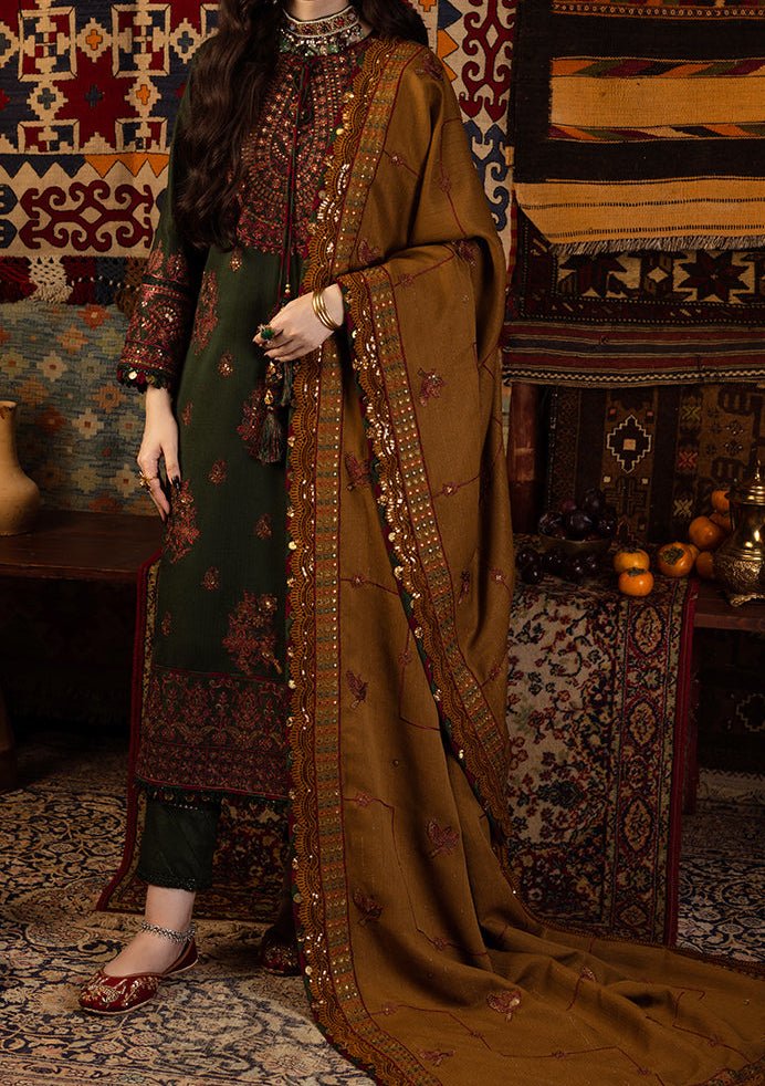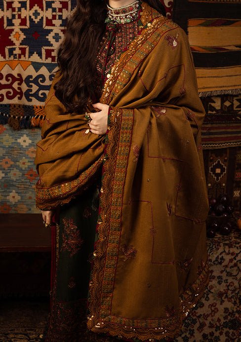 This ensemble is a reflection of timeless artistry, much like the ageless traditions of Kashmir. The shades of dark green and mustard gold, adorned with deep maroonish red, deep gold, and rust threadwork, illuminated by matte gold sequins embroidery, tell a regal tale. The embroidered front neckline and back neckline set the stage for an enchanting narrative. The embroidered border for chaak is a testament to the enduring spirit of Kashmir’s heritage. The shawl, an embodiment of regality, serves as the final chapter in this captivating story.