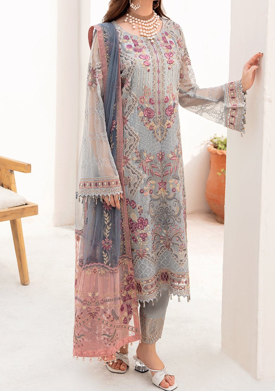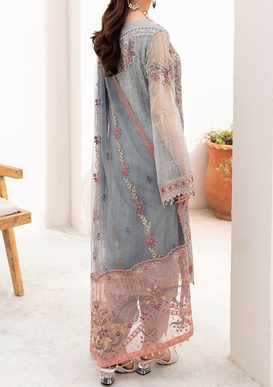 - Embroidered Organza Ghera, and Trouser Lace.